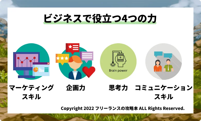 具体的には、ビジネスで役立つ4つの力、思考力・企画力・マーケティング力・コミュニケーション力が鍛えられます。