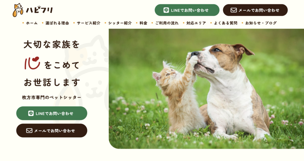 ペットシッター ハピフリは、ペットシッター士などの専門資格を持つスタッフが、ご自宅に訪問し飼い主さまに代わって大切な犬・猫のお世話をいたします。