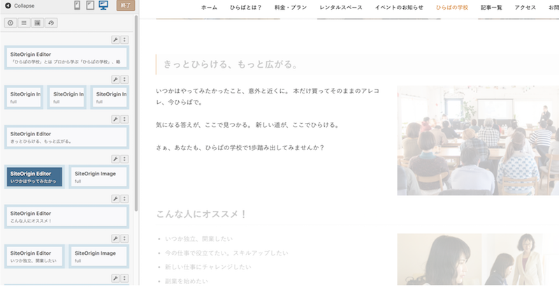 Elementerが最近では話題ですが、個人的にカスタマイズできる情報量が多すぎて自由すぎて使いづらかったりで、ひらばのサイトではPage Builder By SiteOriginを使用しております。