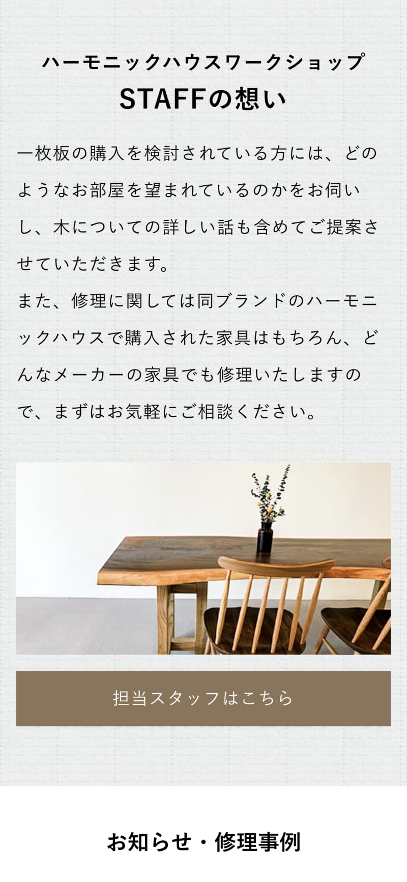 ハーモニックハウスワークショップ 2020年10月25日 岡田 大誠 大阪府枚方市で家具の修理と一枚板の販売を行っておられる ハーモニックハウスワークショップ様のWebサイトのリニューアルを行いました。 URL Copied!